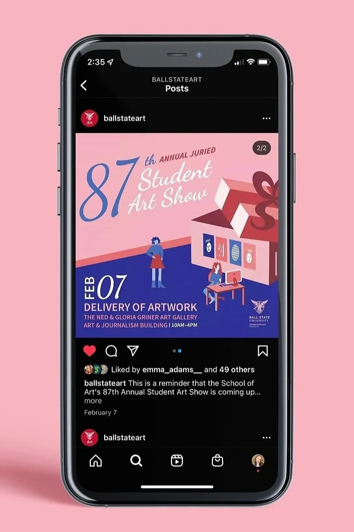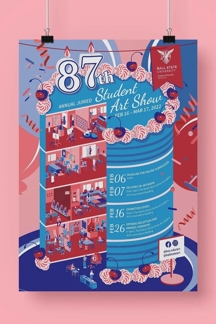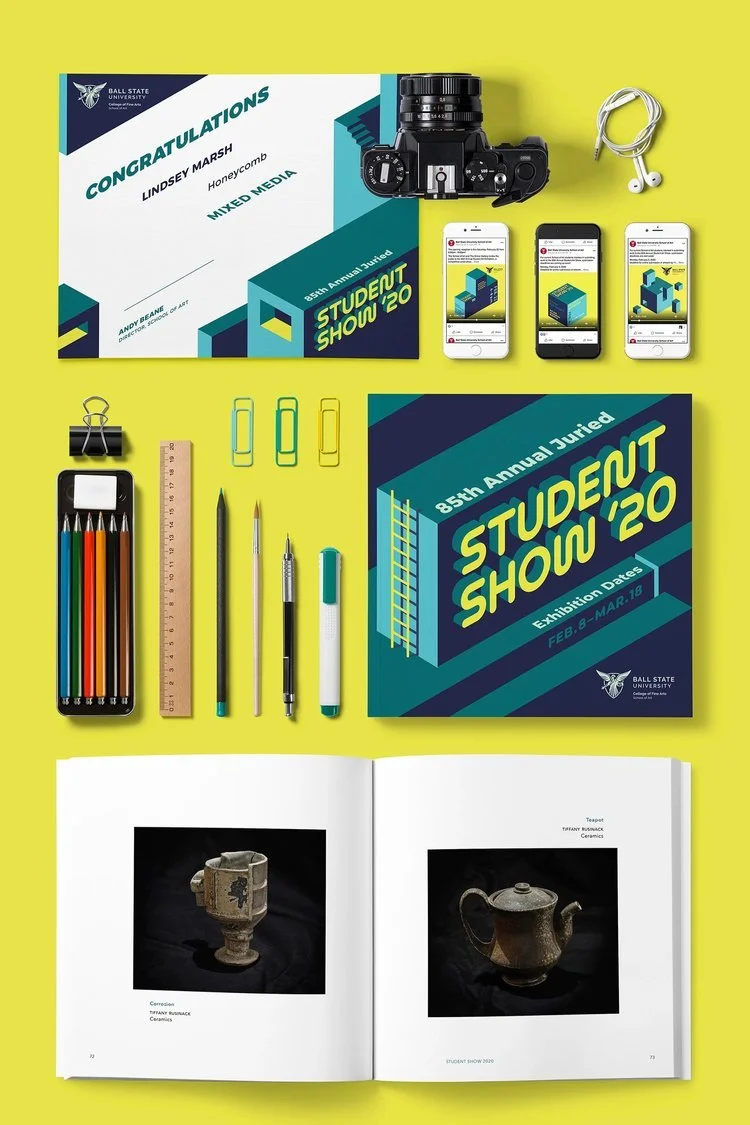Every year Ball State University School of Art organizes a Juried Student Show. These are the designs for the 85th and 87th Annual Juried Student Show. The design for the 85th show was focused on a more angular and 3D style. The 87th show’s design is more illustrative and aimed to showcase all artforms within the art department.